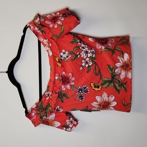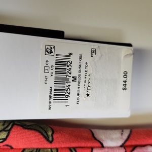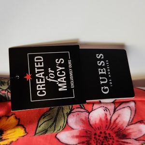 NWT Guess Los Angeles Flourish Fields Sushi Kiss Kae Ruffle top size medium. Beautiful salmon color with floral print, Ruffle v-neck, can be worn on or off shoulders, cotton, modal, spandex blend. Made exclusively fur Macy's. MSRP $44.