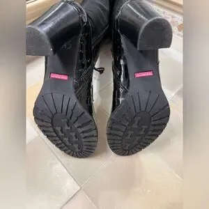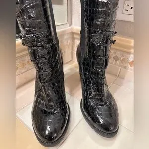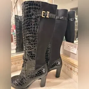 Elegant knee-high boots with a croc-embossed texture. Sleek black design. Has nice room in calf area. In great pre-loved condition.