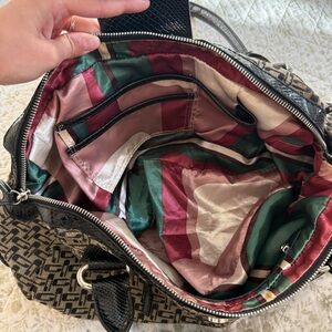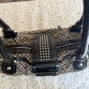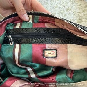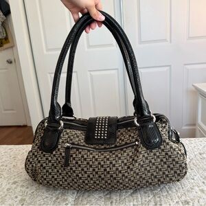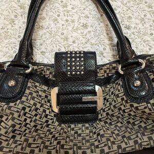 Elegant Guess shoulder bag with monogram pattern. Features black handles and silver accents. Ideal for versatile styling.