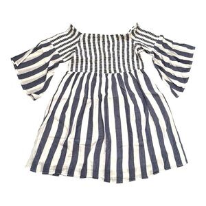 Beautiful dress from Lucky brand in a size large. Blue and white bold stripe pattern with smocking all along the bodice. Off the shoulder style with flared sleeves. Mini length at about 29” in length. Bust measures about 32” but does have stretch due to the smocking. 100% cotton and lined