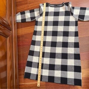 This Ann Taylor dress features a classic sheath style in a striking black and white pattern, perfect for casual or work settings. The long cuffed sleeves and crew neck add a touch of elegance, while the soft fabric ensures comfort throughout the day. SKU 323