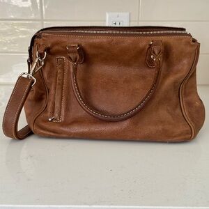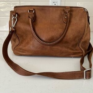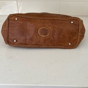 Gently used in excellent condition: Light natural patina adds character, no tears/rips/odors; interior lining has some staining as pictured and the leather has come away from one of the rivets (also pictured). Timeless everyday carryall, 12”L x 9”H x 5”D—perfect for work, errands, or travel.