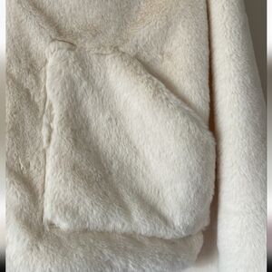 Soft and stylish cream faux fur jacket with a hood. Perfect for chilly days.