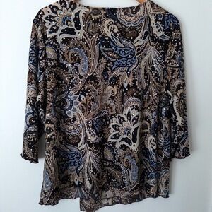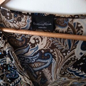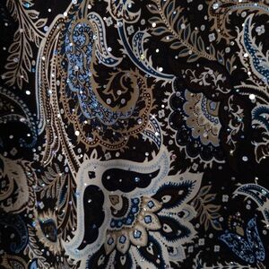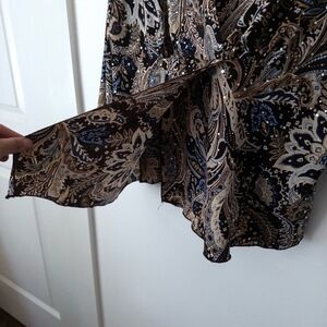 Shimmering Y2K-era paisley blouse with sequins throughout. Features a flattering v-neckline, faux wrap front, and flowy hemline. 3/4 sleeves add elegance, while the lightweight stretch fabric makes it comfortable and versatile. The boho paisley pattern in earthy browns, beige, and pops of blue gives it that late 90s/early 2000s glam vibe. Perfect for nights out, layering with jeans, or dressing up with skirts and heels.