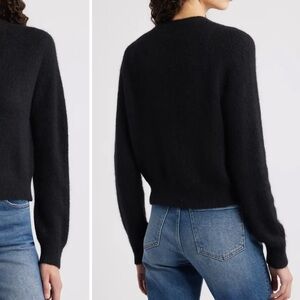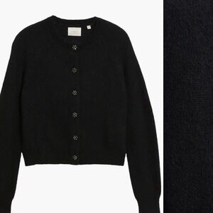Elegant black cardigan with unique button accents. Soft texture. Ideal for layering.