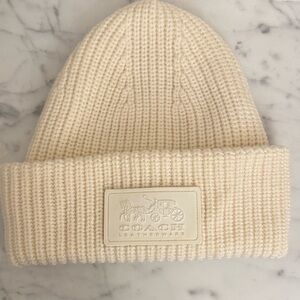 Stylish cream knit beanie. Features Coach logo patch. Perfect for any season.