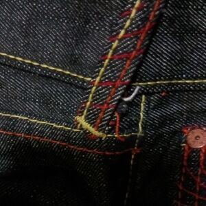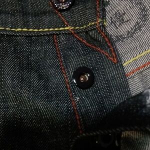 Stylish Vintage collectible men's jeans featuring a unique pocket design. Perfect for casual outings or clubbing.. Available in a classic deep blue color.Samarai And Demon design ,Lot # 1001,Size 40,MINT - NEVER WORN!!!