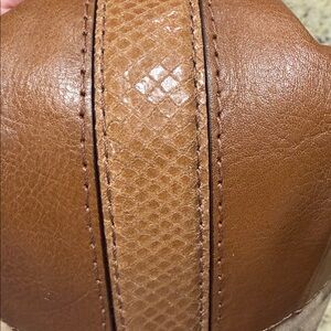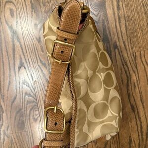 Stylish 2010 Coach shoulder bag with signature pattern. Features golden beige and brown tones. In beautiful condition. Turn lock on each side of the bag. Snake trim. Clean inside. Ideal for versatile wear.