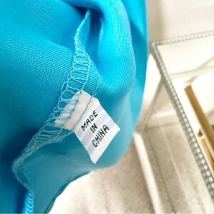 Elegant blue satin kimono robe featuring intricate embroidery. 2 front pockets. Perfect for lounging in style.