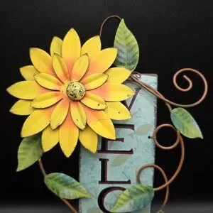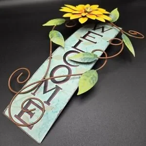 rustic sunflower wall decor, metal sunflower sign, welcome wall hanging, teal sunflower decor, vertical welcome sign, farmhouse wall decor, country home decor, rustic metal art, outdoor welcome sign, sunflower porch decor, teal wall art, cottage farmhouse decor, entryway wall sign, garden wall decor, patio decor sign, shabby chic decor, floral metal wall hanging, rustic entry decor, farmhouse welcome sign