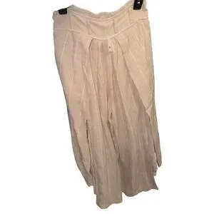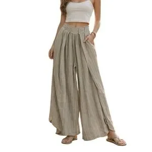 Free People Sand Combo striped wide-leg pants offer a relaxed, bohemian aesthetic with a breezy 100% cotton gauze construction. These high-waisted trousers feature a distinctive wrap-front pleated design that creates a voluminous, skirt-like silhouette, complemented by a comfortable elastic back waistband and functional side pockets. The neutral tan and white pinstripe pattern makes them a versatile staple for beach outings or casual summer styling.