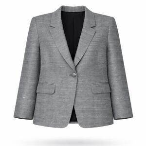 Lafayette 148 New York tailored blazer in a charcoal/black/white textured tweed weave with subtle silver sparkle flecks. Classic notched lapel with a single-button front, flap pockets, and a smooth black full lining—polished for workwear, meetings, events, or elevated everyday styling.