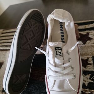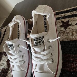 Stylish Converse low-tops in white canvas. Accented with a red stripe and classic design.