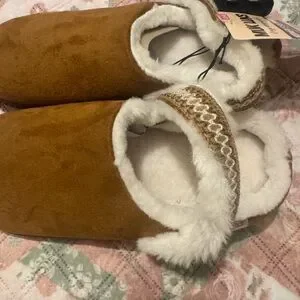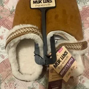 Cozy Muk Luks slippers. Soft faux fur lining. Comfortable slip-on design.