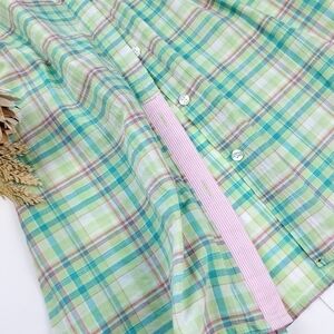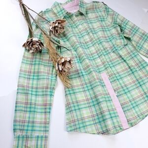 Madison Hill Green Pink Plaid Casual Button Down Shirt Sz Medium Petite
