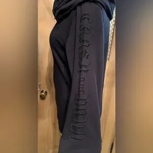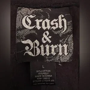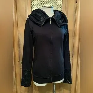 Great goth full zip hoodie by Crash and Burn. Black with raw-edge seams, featuring sequins and embroidery. Has cowl style hood. 2 pockets. Great condition. Size large.