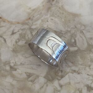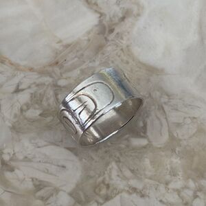 Vintage hand carved sterling silver ring by indigenous artist Corrine Hunt. The ring features a salmon. Salmon are deeply intertwined with First Nations cultures, traditions, and ceremonies. They are often viewed as gift-bearing relatives and are treated with great respect. Salmon are featured in many art forms, stories, and dances. Corrine Hunt is a member of the Raven Gwa’wina clan from Ts’akis, a Komoyue village on Vancouver Island. Her rich family history includes internationally renowned First Nations artists George Hunt, Henry Hunt, Richard Hunt and Tony Hunt, all of whom have been influential on her art. Born in Alert Bay in 1959, Corrine’s paternal grandmother A’neesla’ga,’ a Tlingit noblewoman from Alaska, gave her the name ‘Killer Whale Scratching Her Back on the Beach’ in 1965. Since 1985 she has been creating contemporary art that reflects the themes and traditions of her First Nations Komoyue and Tlingit heritage. Corrine designed the logo for the World Peace Forum held in Vancouver, 2006. There were installations of her work at the Hilton Hotel, Whistler, and the Office for Indian and Northern Affairs Canada. In 2009, she co-created the medals for the 2010 Olympic Games held in Vancouver. These featured her original designs of the Pacific Northwest Coast crest figures of the Killerwhale and Raven. Corrine’s artistic endeavours were recognized with the National Aboriginal Achievement Award in 2011. From smoke/pet free home Same day shipping