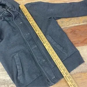 Cozy charcoal hoodie with striking red emblem. Features button front and roomy pockets. Ideal for everyday comfort.