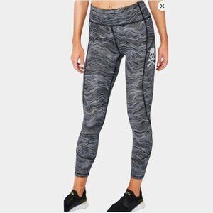 Features: Wide supportive waistband, allover wave dot print, side leg skull and crossbones graphic detail, hidden waistband pocket, four-way stretch, sweat-wicking fabric, flatlock seams for comfort
