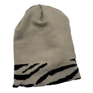 Vans Off the Wall animal print beanie. Beige cuffed hat with black leopard stripes and subtle black logo tag. Double-layer comfy stretch knit in acrylic/nylon/elastane. Unisex styling fits most adults. Heritage skate surf brand in a modern print. Cold weather essential for outdoor lifestyles, skater grunge, snowboarding, and after surf sessions. Great for streetwear or collectors of Vans gear.