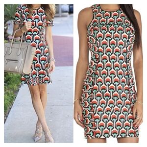 Milly green, red and black geometric sheath dress. Dress features zip closure and leather collar. Fully lined. See all photos for details. Questions please ask.