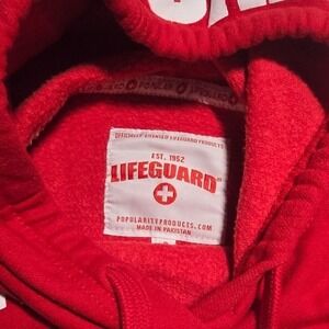 womens top as new S Lifeguard + established 1952 by Popularity Products red with bright white iron on logo cut off sweatshirt, nice weight, clean; I don't know if someone cut this off. Or if it was cut, but Well, there's a tag, so it looks like it was made this way because the tag's up pretty high then 21" across chest (pit to pit), 22.5" sleeve length, cuff seam 4.5" across, 5" underarm to cropped hem, 22" across the cutoff hem, 14" overall length measured from center back neckline to lower back cutoff hem, 12" length in front, 80*/20 cotton/poly, treim 95/5 cotton, spandex , machine washanble RN# 100269 Brand: Lifeguard