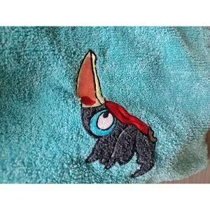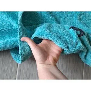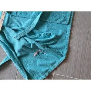 This turquoise robe offers a soft and absorbent terry cloth material with fun embroidered designs of a monkey and toucan, tailored for children.