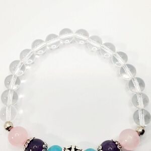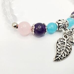 Attention all elephant lovers! This Hand Crafted Natural Quartz Crystal Charm Bracelet With Mixed Stone Beads, Alloy Elephant and Leaf Charm is a great gift for all elephant lovers. The bracelet includes teal, purple, pink, and clear crystal stone beads with leaf alloy spacers surrounding the purple stone bead. This bracelet is a stretch bracelet (approximately 2.5 inches in width) allowing it to fit most wrist. This bracelet has so much character allowing the perfect elephant lover to style it.