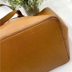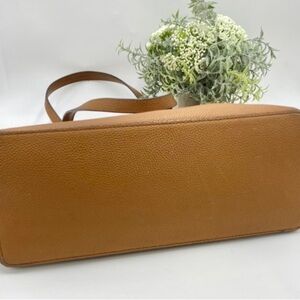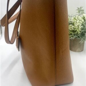 Carry it all in this sturdy leather tote. Even has an adjustable turn lock, so you can fill it up and still close it! Gold tone hardware, 10" long handles. Laptop compatible 13-15". This bag is large enough to carry everything for your "day at work"; lunch, water bottle, comfy shoes or dressy heels for "after work", laptop/tablet, wallet, umbrella etc. Great weekend travel bag too. You will get a lot of use with this bag..Acorn/saddle color.