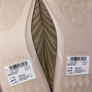 The Clarks Cloudsteppers Carly Hope Knit Ballet Flats in Beige Zebra Pattern are a stylish and comfortable choice for women. These slip-on flats feature a round toe, flat heel, and a soft bow accent. Made with synthetic upper material and a foam insole, these shoes are perfect for casual occasions in the warmer seasons. The beige color with a zebra pattern adds a fun and trendy touch to the classic ballet style. Perfect for walking and all-day wear, these Clarks Cloudsteppers combine fashion and functionality. NON SMOKING NON PET HOME. NO ORIGINAL BOX.