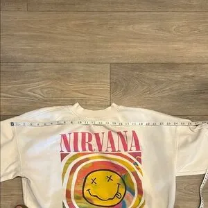 Embrace comfort with this NIRVANA crewneck. Features a bold multicolor graphic on a white base. Gently worn and has a couple spots from storage that should come out with spray and wash. See pics