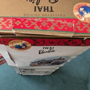 New in original box Thai Barbie collectors edition in traditional attire. Features green dress with gold accents. Perfect for collectors of the Dolls of the World Barbie collection Mattel released circa 1990s. Box has some crush damage, see photos for details. never opened. complete with headdress and hair brush.