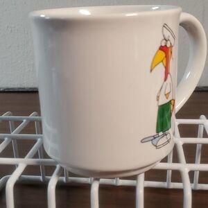 Sandra Boynton designed this cute mug with a chicken wearing a shoe on his head & a hat on his foot. It says. "Don't worry, I've got everything under control" printed upside down on the other side. Approximately 3½" tall, 3½" across at the top.