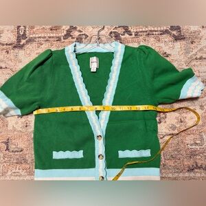 Vibrant green cardigan with button-down front. Features scalloped trim and short sleeves. Stylish and chic design.