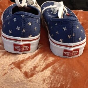 Navy Vans Authentics, womens size 7, with silver star pattern, red accents, and white laces. Perfect for the 4th of July, but adorable all year! These Vans are new without the tags or box.
