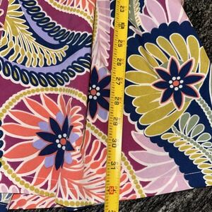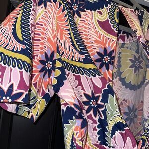 This Milk & Honey short sleeve top romper in size L features a crew neck and a pullover closure. Made of 100% polyester fabric, it has a floral paisley pattern with pleated and ruched accents. The bohemian-inspired design is perfect for summer, fall, and spring occasions like travel, parties, or casual wear. With its colorful and whimsical theme, this mini romper with puff sleeves and a belted waist adds a touch of Belle-inspired style to your wardrobe. Hand wash only to maintain its quality.
