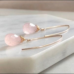 Beautiful natural rose quartz tear drop stone marquis earrings with 14 karat gold filled ear wire. Hand made. Delicately regal and beautiful.