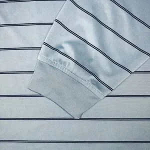 Pebble Beach Performance long sleeve polo shirt in light blue with dark blue stripes. This classic collared shirt features a three-button placket and banded cuffs. The performance fabric is designed for comfort and ease of movement.