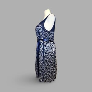 This elegant sleeveless midi or tea-length dress showcases exquisite all-over floral embroidery, accented with shimmering metallic details that contrast beautifully against a delicate mesh overlay. A solid satin ribbon tie belt cinches the waist, adding a flattering silhouette.