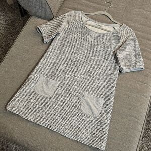 Stylish gray striped tunic with short sleeves and front pockets. Perfect for casual outings.