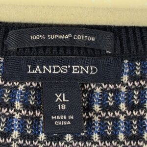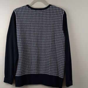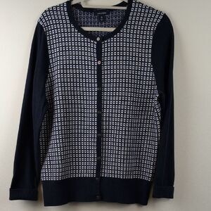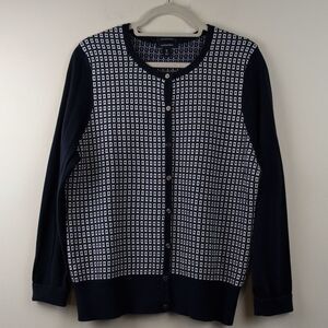 Stylish Lands' End navy and white patterned cardigan with button closure. This sweater features long sleeves, a patterned grid design on the body and solid navy on the sleeves, button front with gold and navy buttons, and a soft, fine gauge knit. 100% supima cotton. Size 18.