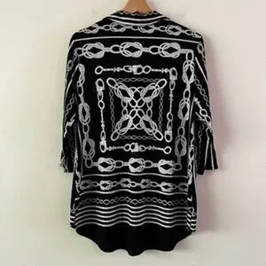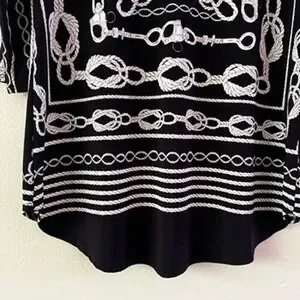 Poly/spandex performance material nautical top. Longer length with curved hem, 3/4 length sleeves, v-neck, collar, lightweight.
