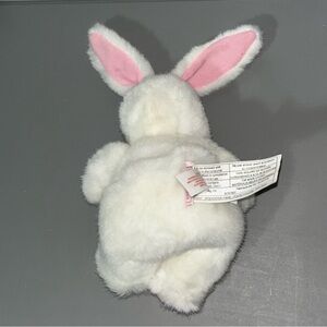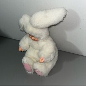 This particular doll is a vintage Anne Geddes baby doll dressed in a white Easter bunny outfit. It features a plastic face and hands with a soft, bean-filled plush body