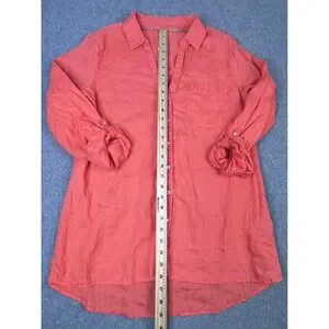 The Sigrid Olsen Women's Size Medium Linen Top in Orange is a stylish and lightweight tunic with a V-neckline and button closure. Perfect for various occasions like weddings, parties, casual outings, and formal work events, this breathable top features long roll tab sleeves and a relaxed fit. Made from down fabric and adorned with button accents and a pocket detail, this top is machine washable and ideal for the summer, fall, and spring seasons. The vibrant orange color adds a pop of color to your wardrobe, making it a versatile and chic addition for any fashion-forward woman.