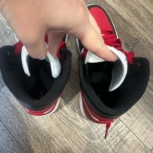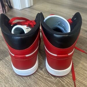Women’s air Jordan 1 mid in red white and black with red sole. Worn once indoors brand new. Size 8
