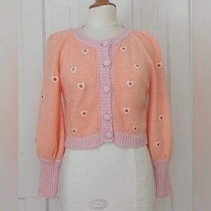 For Love & Lemons Lovejoy Cropped Cardigan in Peach. 78% acrylic & 22% nylon. Heart shaped enamel eyelets & subtle bell sleeves. 19 inches in length, 18 inches from armpit to armpit & 23 inch sleeve. Size Medium. Worn once, like new
