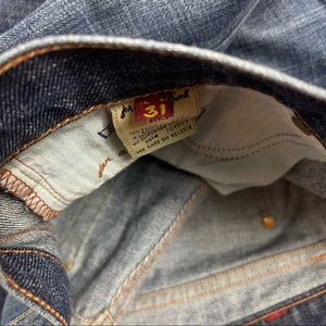 7 For All Mankind Rhinestone Pocket Bootcut Jeans. Zip up with button closure. 5 pocket cut. Orange rhinestones on back pockets. Bottom hem has some distressing from wear (shown in last 2 pictures). Good pre-owned condition. Size 31.