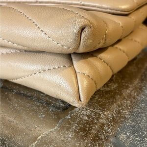 Chic quilted design with gold logo. Versatile beige color. Perfect for any occasion.