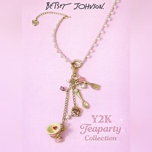 Authentic Betsey Johnson Y2K Teaparty Collection charm necklace featuring whimsical tea party themed charms on a faux pearl chain.