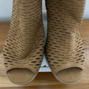 CL by Laundry Women Honey Brown Ankle Boots Sz 9.5M Chunky Heels Peep Toe Detail